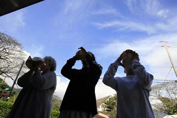 ![]() Sally Roggia, left, 17-year-old Kaipo Lucas, and Lucas' brother Kapono, 12, blow conch shells prior to the start of the service. Photo by Jamm Aquino |